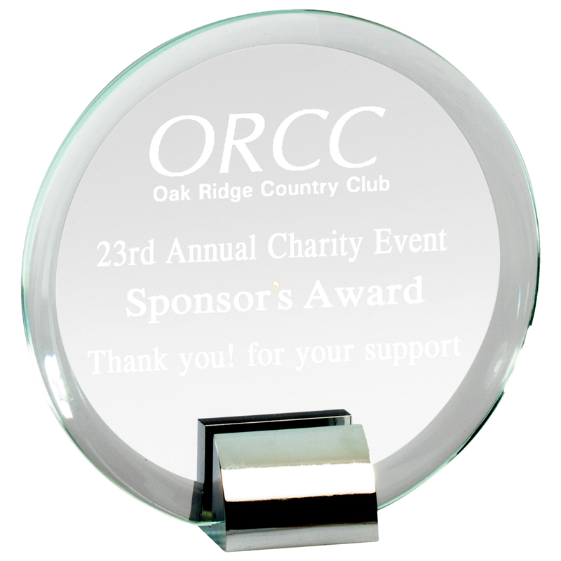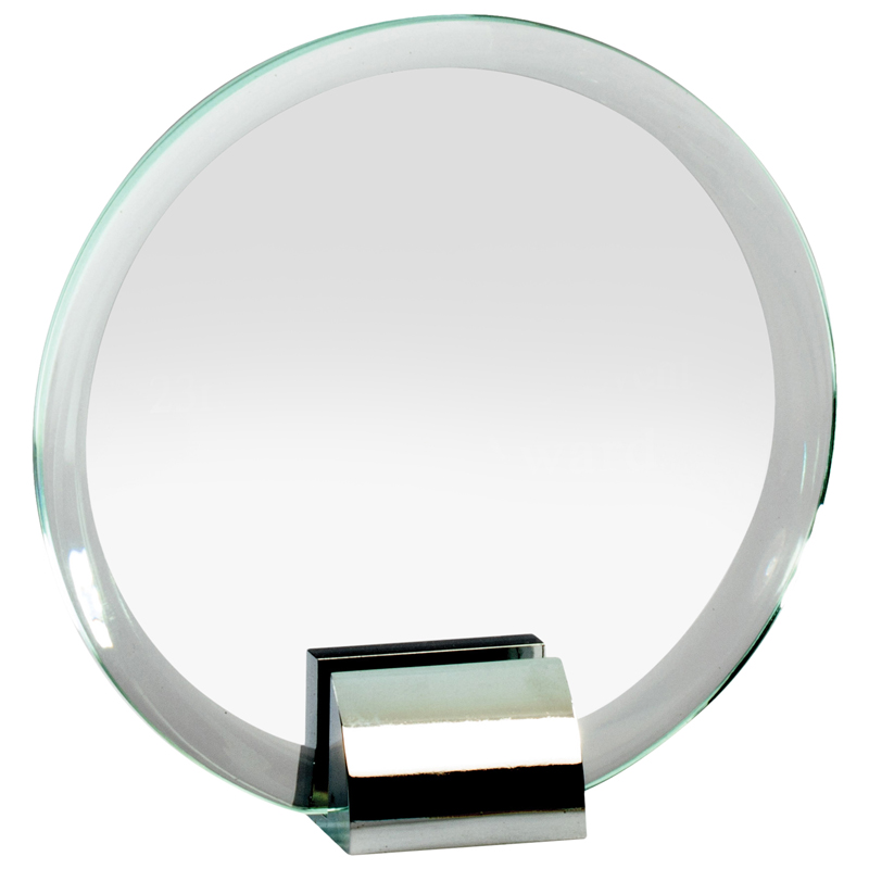 Item Description: Round optical crystal award measuring 5-1/4 inches in diameter. Features frosted edges and is mounted on a polished silver metal base. Comes packed in a deluxe presentation box.