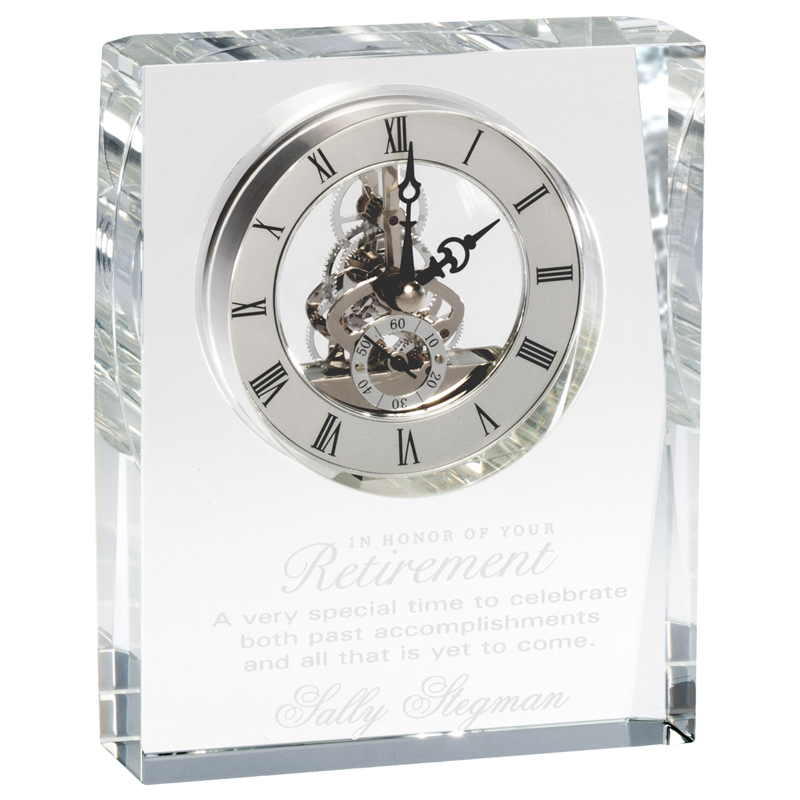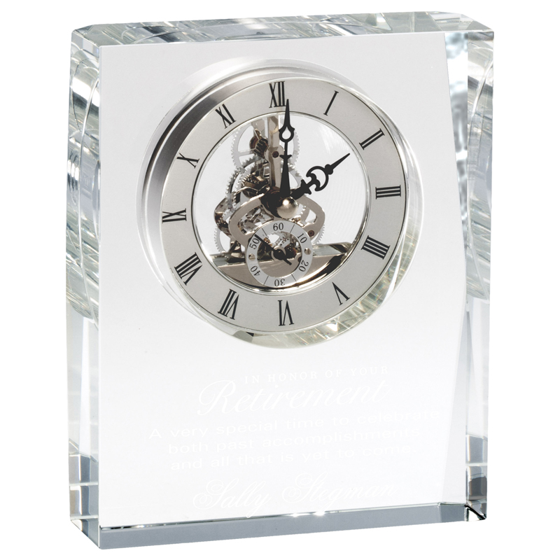 Item Description: Optical crystal elegant skeleton precision quartz desk clock in a square shape. Dimensions are 6-1/4 (height) x 5 (width). Comes individually boxed.