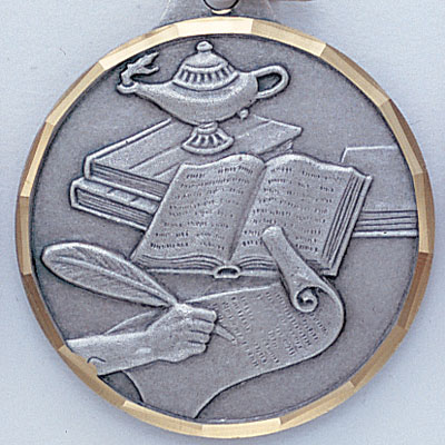 This 1-1/4 inch die-struck medal bears a variant of the 'lamp of learning' design on the front face and has a scalloped border to mimic a diamond cut style. The design depicts the lamp of learning atop a few books, and a hand using a quill on a scroll. This variant of the medal is available only in silver and can be engraved or imprinted on the back face. - IMPRINTING COPY MUST ALL BE THE SAME.