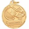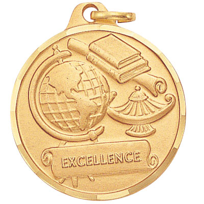This 1-1/4 inch die-struck medal bears an image similar to the academic achievement design, with the key difference being the text stamped into the scroll in the bottom center of the graphic. The design depicts a globe, some books, a lamp, and 'Excellence' inscribed on a scroll. This medal only comes in gold, and it can be engraved or imprinted on the back. The perimeter of the medal is detailed with a method of scalloping identical to diamond cut engravings. - IMPRINTING COPY MUST ALL BE THE SAME.