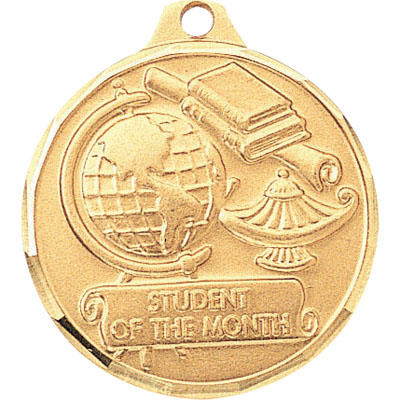 This 1-1/4 inch die-struck medal bears a design similar to the academic achievement design, with the key difference being the text stamped into the scroll in the bottom center of the graphic. The design illustrates a globe, some books, a lamp, and 'Student of the Month' inscribed upon the center scroll. This medal is only available in gold, and it can be engraved or imprinted on the back. The medal is bordered with a method of scalloping to match diamond cut engravings. - IMPRINTING COPY MUST ALL BE THE SAME.