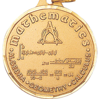 This 1-1/4 inch die-struck mathematics medal has its front face decorated with various mathematical equations, and 'Algebra - Geometry - Calculus' printed along the bottom border. Around the top half curve 'Mathematics' is engraved in a different font and size. This medal is available in gold, silver, or bronze and it can be engraved or imprinted on the back. The medal is bordered with a method of scalloping to match diamond cut engravings. - IMPRINTING COPY MUST ALL BE THE SAME.