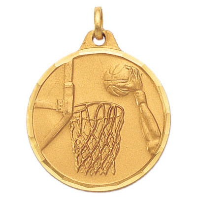 The front face of this 1-1/4 inch die-struck sports medal illustrates a basketball being thrown into a hoop, as well as a diamond-cut scalloped border that adorns the edge of the medal. This is available in gold, silver, or bronze, and the back face can be custom engraved or imprinted. - IMPRINTING COPY MUST ALL BE THE SAME.