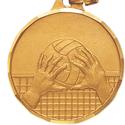 The engraving on the front face of this 1-1/4 inch die-struck sports medal depicts a pair of hands throwing a volleyball over a net, and the edge of the medal is diamond-cut in a clean scalloped style. It has room on the back face for custom engraving or imprinting, and it is available only in gold. - IMPRINTING COPY MUST ALL BE THE SAME.