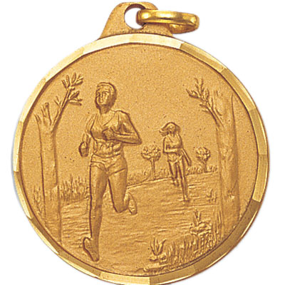 The front face of this 1-1/4 inch sports medal depicts a pair of female athletes running along a wooded path, as well as a diamond-cut scalloped border that adorns the edge of the medal. This is available in gold, silver, or bronze, and the back face can be custom engraved or imprinted. - IMPRINTING COPY MUST ALL BE THE SAME.
