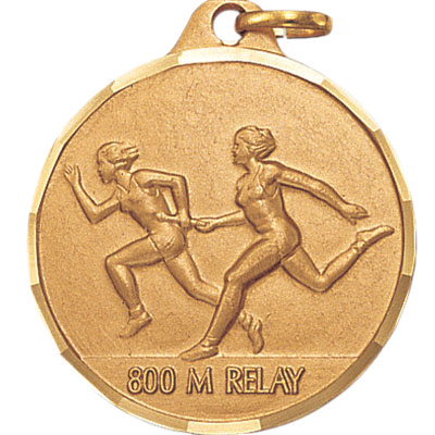 This variant of 1-1/4 inch die-struck track medal is engraved on its front with an image of two female runners trading a relay baton next to text that reads: '800 M RELAY'. The border of the medal is scalloped, identical in style to diamond cut engraving, and it is available in gold, silver, or bronze. - IMPRINTING COPY MUST ALL BE THE SAME.