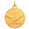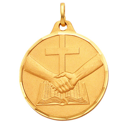 This 1-1/4 inch medal is decorated with an engraving of a handshake over an open book in front of a cross. The border is scalloped to look diamond-cut, the backface can be custom engraved or imprinted, and it is available in gold, silver, or bronze. - IMPRINTING COPY MUST ALL BE THE SAME.