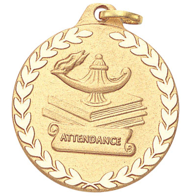 This 1-1/4 inch die-struck medal bears an engraved illustration of a lamp atop two books with a scroll reading 'Attendance' in front of them, as well as a wreathed pattern of leaves decorating the border. The back face of the medal can be engraved or imprinted and it is only available in gold. - IMPRINTING COPY MUST ALL BE THE SAME.