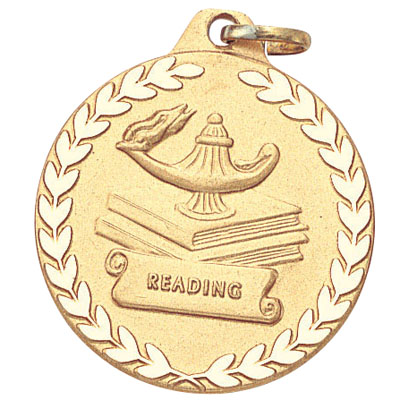 This 1-1/4 inch die-struck medal is engraved with a variation of the 'wreathed lamp' design that depicts a lamp atop two books accompanied by a scroll with 'Reading' printed onto it in front of them; the same wreathed pattern of leaves decorates the border that is present on the original design. The back face of the medal can be engraved or imprinted and it is only available in gold. - IMPRINTING COPY MUST ALL BE THE SAME.