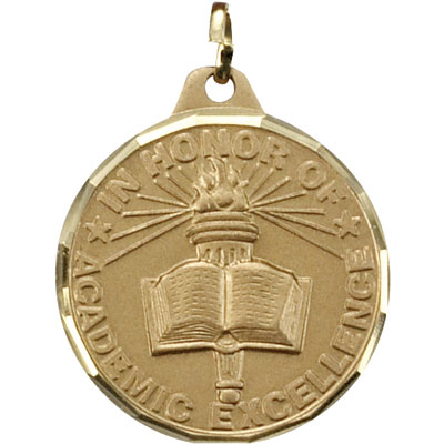 This 1-1/4 inch die-struck medal is bordered with a method of scalloping that is identical to diamond cut engraving. It comes in multiple colors and can be engraved or imprinted only on the back face, as the front face is occupied by a design depicting an open book in front of a gleaming torch, and the words 'In Honor of Academic Excellence' stamped around the inner perimeter following the cirucular curve of the medal. This medal is available in gold, silver, or bronze. - IMPRINTING COPY MUST ALL BE THE SAME.