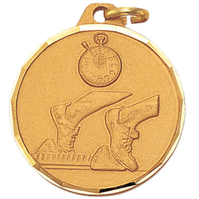 The engraving that occupies the front of this track themed medal depicts a pair of track shoes lined up on a starting block underneath a stopwatch.The border of the medal is scalloped, identical in style to diamond-cut engraving, and it is available in gold, silver, or bronze. The back face can be custom engraved or imprinted. - IMPRINTING COPY MUST ALL BE THE SAME.