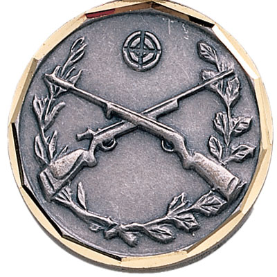 This 1-1/4 inch die-struck marksmanship medal has a detailed engraving on its front of a pair of crossed rifles within a laurel wreath. The border of the medal is scalloped, identical in style to diamond-cut engraving, and it is available in gold, silver, or bronze. - IMPRINTING COPY MUST ALL BE THE SAME.