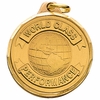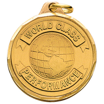 This 1-1/4 inch die-struck 'World Class Performance' medal is engraved with a design illustrating a globe that is surrounded on the top and bottom with banners of text that read; 'World Class' on the top banner, and 'Performance' on the bottom banner. This medal has a scalloped border that matches the look of diamond engravings, and is available only in gold. The backside can be custom engraved or imprinted. - IMPRINTING COPY MUST ALL BE THE SAME.