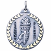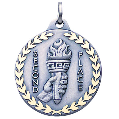 This 1-1/4 inch second place medal is decorated with an engraving of an ornate flaming torch with 'Second Place' inscribed to its left and right. The inner perimeter is engraved with a simple wreath, and the border is scalloped to look diamond-cut. This medal is available in silver only, and the back face can be imprinted or engraved. - IMPRINTING COPY MUST ALL BE THE SAME.