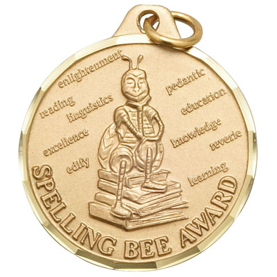 The perimeter of this 1-1/4 inch die-struck 'Spelling Bee Award' medal is bordered with a method of scalloping that is identical to diamond cut engraving. It is available in gold, silver, and bronze and can be engraved or imprinted on the back face, as the front face comes negraved with the spelling bee design. It illustrates a bee sitting on top of a stack of books, with various words hovering around them; 'Spelling Bee Award' is imprinted along the bottom curve of the graphic. - IMPRINTING COPY MUST ALL BE THE SAME.