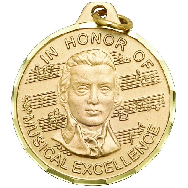 This 1-1/4 inch die-struck medal is bordered with a method of scalloping that is identical in appearance to diamond cut engraving. It comes in multiple colors and can be engraved or imprinted only on the back face, as the front face is decorated with a design illustrating the bust of a musician with lines of sheet music in the background; following the inner circumference of the image is the phrase: 'In Honor of Musical Excellence'. This medal is available in gold, silver, or bronze. - IMPRINTING COPY MUST ALL BE THE SAME.