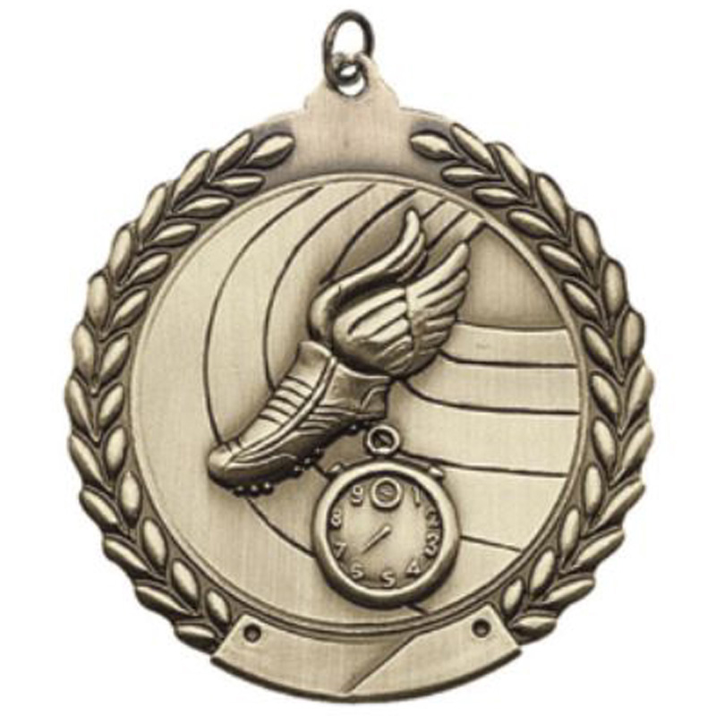 Item Description: 2-3/4 inch 3 dimensional die cast in satin antique brass, silver or bronze finish medal with Track subject.