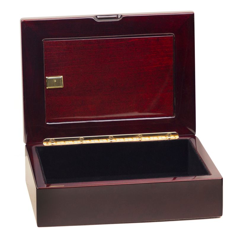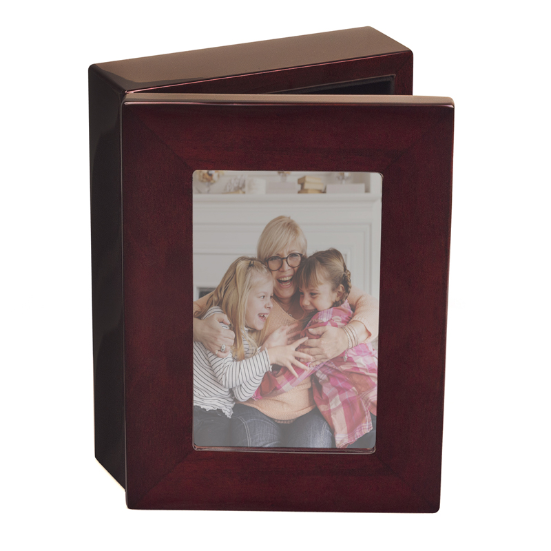 Item Description: Rosewood piano finish keepsake photo box. Includes a glass plate insert on the lid of the box that can hold up to a 5-1/2 (height) x 3-1/2 (width) inch photo. Photo is inserted inside the box via a latch locking mechanism on the photo insert area. Measurements of the box are 7-1/4 (height) x 5-1/4 (width) x 2-1/2 (length) inches. Box cannot be engraved.