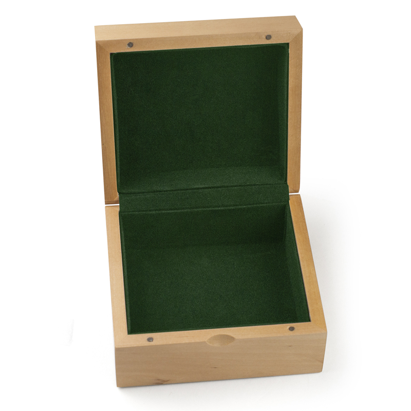 Item Description: Hard wood finish keepsake box with green velvet lining on inside. Dimensions of box are 4-1/4 x 4-3/4 x 2-3/4 inches, weight is 1/2 pound. Perfect for holding small, precious items - top outside of box can be personalized with engraving of text or logo, or both.