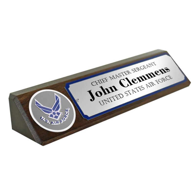 Item Description: Genuine walnut desk block with U.S. Air Force medallion insert. Comes with silver matte name plate for engraving. Desk block size is 10-1/2 inch x 3 inch. Plate size is 7-1/2 inch x 1-3/4 inch.