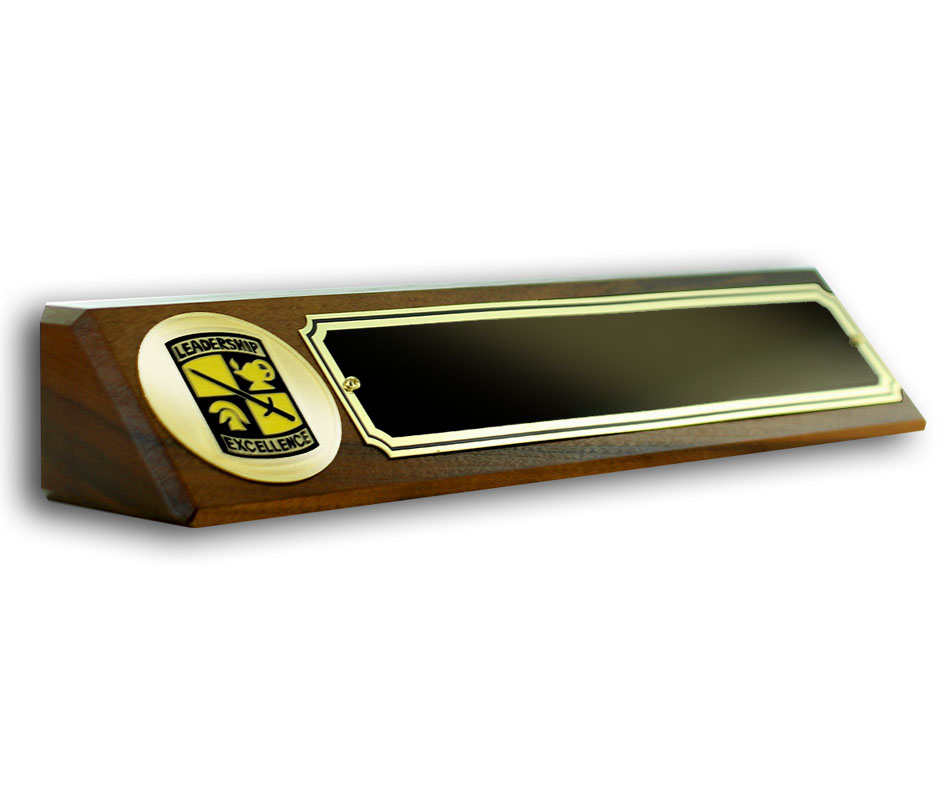 Item Description: Genuine walnut desk block with ROTC medallion insert. Comes with black screened name plate for engraving. Desk block size is 10-1/2 inch x 3 inch. Plate size is 7-1/2 inch x 1-3/4 inch.
