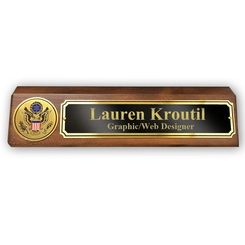 Item Description: Genuine walnut desk block with U.S. Great Seal medallion insert. Comes with black screened name plate for engraving. Desk block size is 10-1/2 inch x 3 inch. Plate size is 7-1/2 inch x 1-3/4 inch.