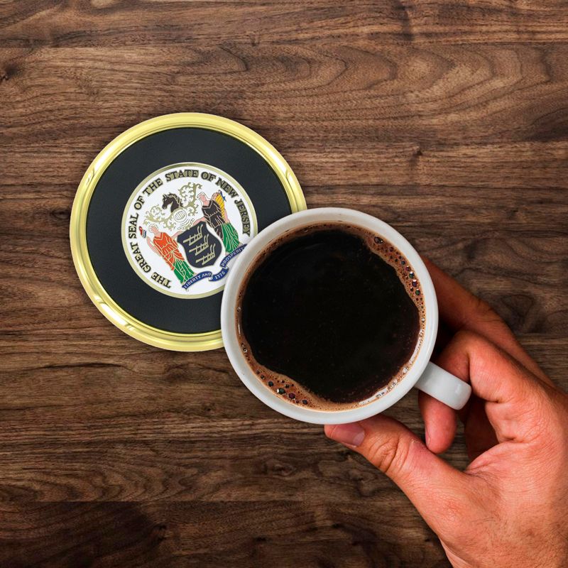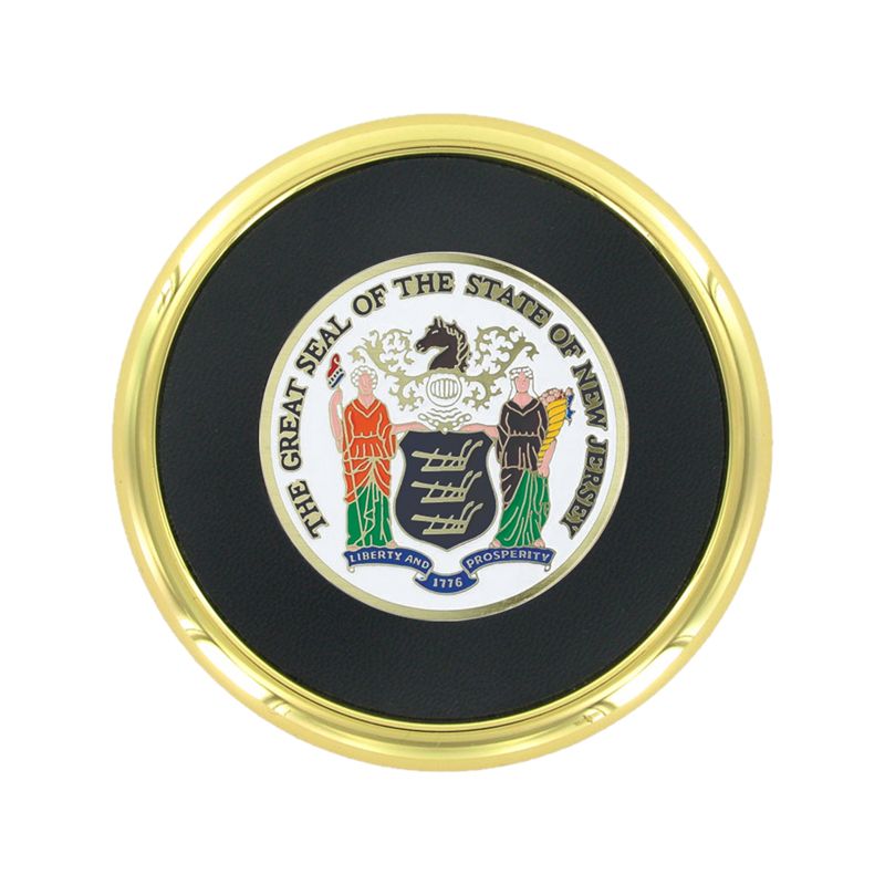 3-5/8 inch coaster with bright gold rim and leatherette center. Features 2 inch State of New Jersey etched enameled brass medallion insert.