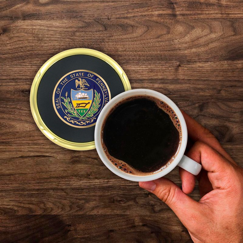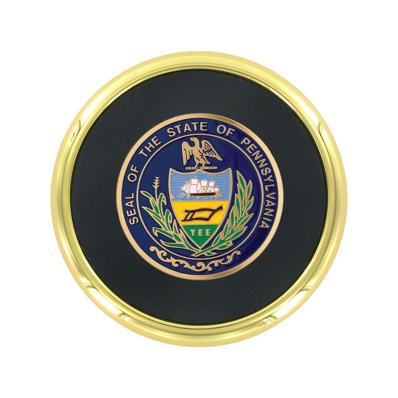 3-5/8 inch coaster with bright gold rim and leatherette center. Features 2 inch State of Pennsylvania etched enameled brass medallion insert.