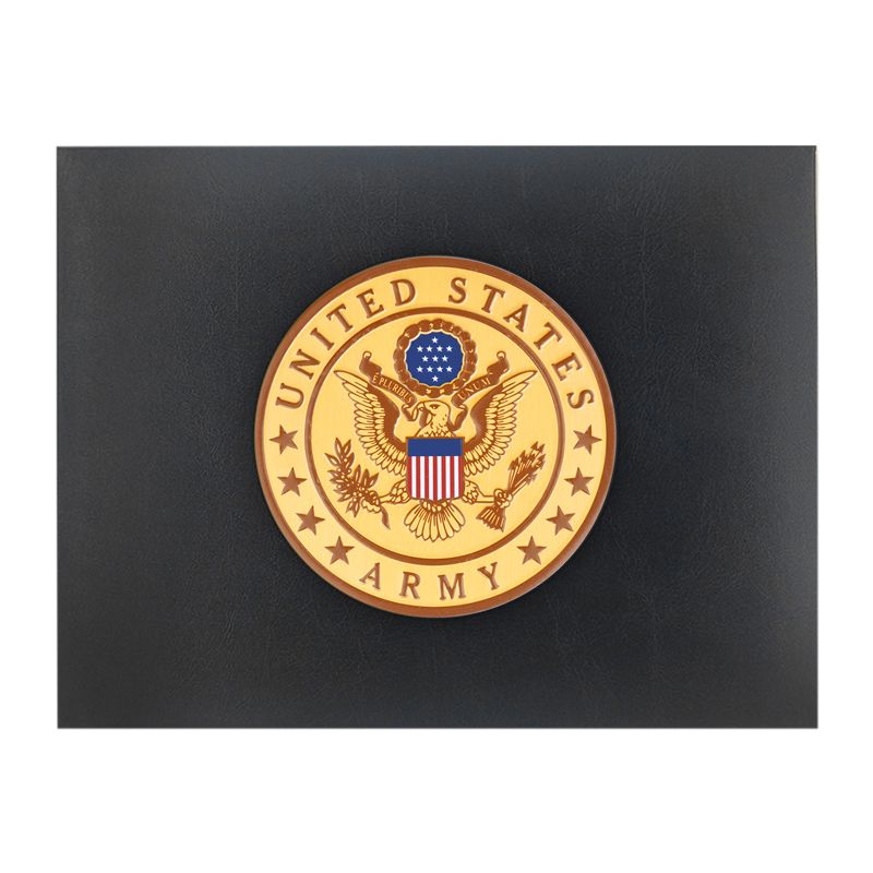 Item Description: Black certificate holder with satin inside cover. Comes affixed with 4 inch Gold United States Army insignia medallion. Holds a 8-1/2 x 11 inch certificate.