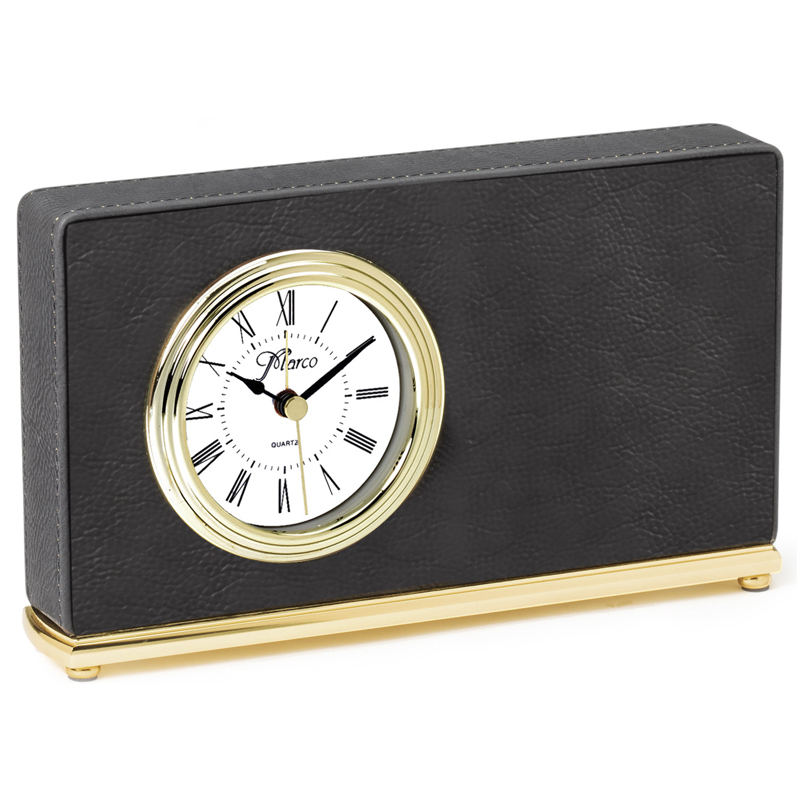 Item Description: Black leatherette (rich imitation laserette) quartz movement desk clock. Clock has a white face with black numbers and is outlined with gold detailing. Dimensions are 7-1/2 (width) by 4-1/2 (height) inches. Text lasers through in gold. Individually boxed.