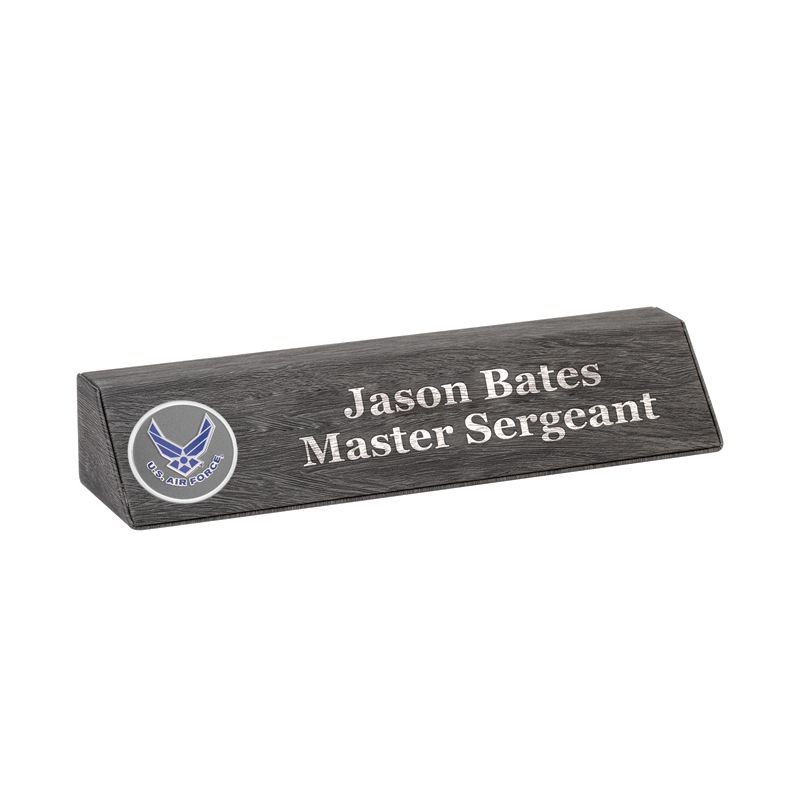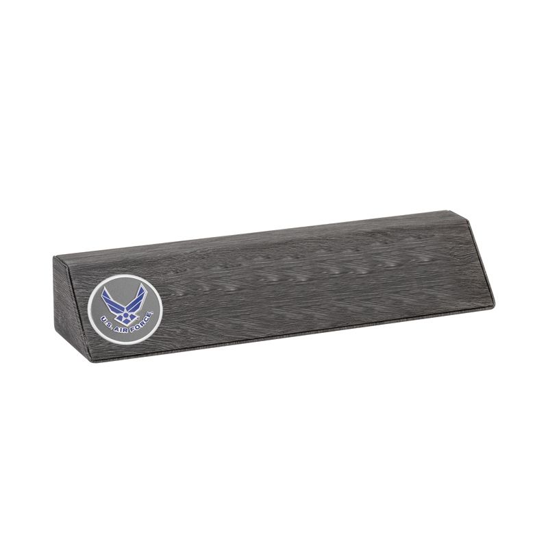 Item Description: Grey leatherette desk block with 2 inch U.S. Air Force Logo medallion insert with room for personalization. Desk block size is 10-1/2 inch x 3 inch.