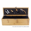 Item description: Genuine bamboo wood wine box with four piece wine tool kit. Includes a wine corkscrew, an aerator, a foil cutter, and a stopper. Box is lined in black satin and features a satin pad that can be used as a protective covering for the bottle of wine that it stores. Box measurements are 14-1/4 (length) x 4-1/2 (depth) x 4-3/4 (height) inches.