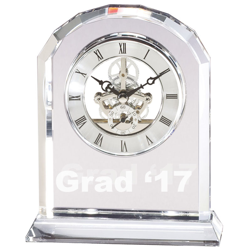 Item description: 6-3/4" x 5-1/2" x 2 inch clear CRYSTAL desk Quartz clock. Comes gift boxed.