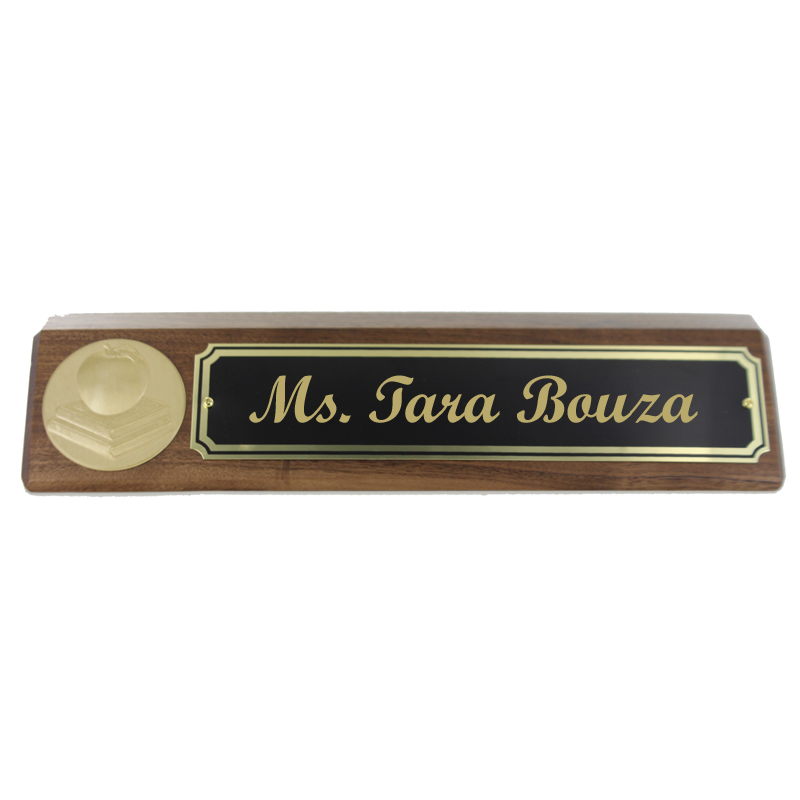 Item Description: Genuine walnut desk block with Apple and Books stamped medallion insert. Comes with black screened brass name plate for engraving. Desk block size is 10-1/2 inch x 3 inch. Plate size is 7-1/2 inch x 1-3/4 inch.