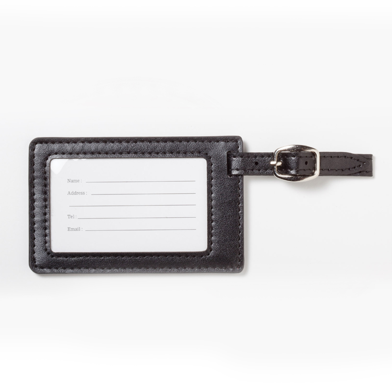 Item description: 2-3/4"x4-1/4"Leatherette key chain in Black. Can be laser engraved in gold lettering on back.