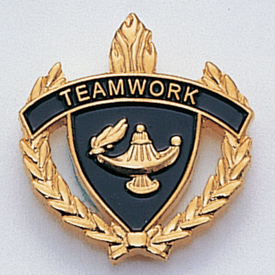 Item Description: 1 (height) x 7/8 (width) inch enameled 3-dimensional academic award lapel pin with butterfly clutch back. Pin features wreath border design with lamp of learning in the center. Banner reads, "TEAMWORK". Polybagged.