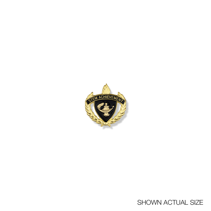 Item Description: 1 (height) x 7/8 (width) inch enameled 3-dimensional academic award lapel pin with butterfly clutch back. Pin features wreath border design with lamp of learning in the center. Banner reads, "STEM ACHIEVEMENT". Polybagged.