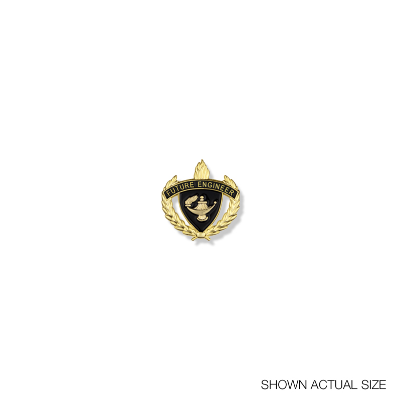 Item Description: 1 (height) x 7/8 (width) inch enameled 3-dimensional academic award lapel pin with butterfly clutch back. Pin features wreath border design with lamp of learning in the center. Banner reads, " FUTURE ENGINEER". Polybagged.