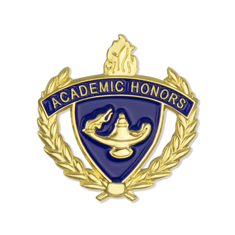 Item Description: 1 (height) x 7/8 (width) inch enameled 3-dimensional academic award lapel pin with butterfly clutch back. Pin features wreath border design with lamp of learning in the center. Banner reads, "ACADEMIC HONORS". Polybagged.