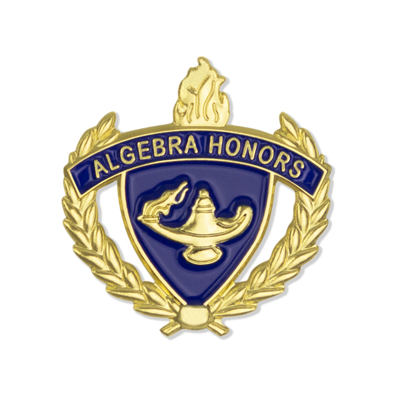 Item Description: 1 (height) x 7/8 (width) inch enameled 3-dimensional academic award lapel pin with butterfly clutch back. Pin features wreath border design with lamp of learning in the center. Banner reads, "ALGEBRA HONORS". Polybagged.