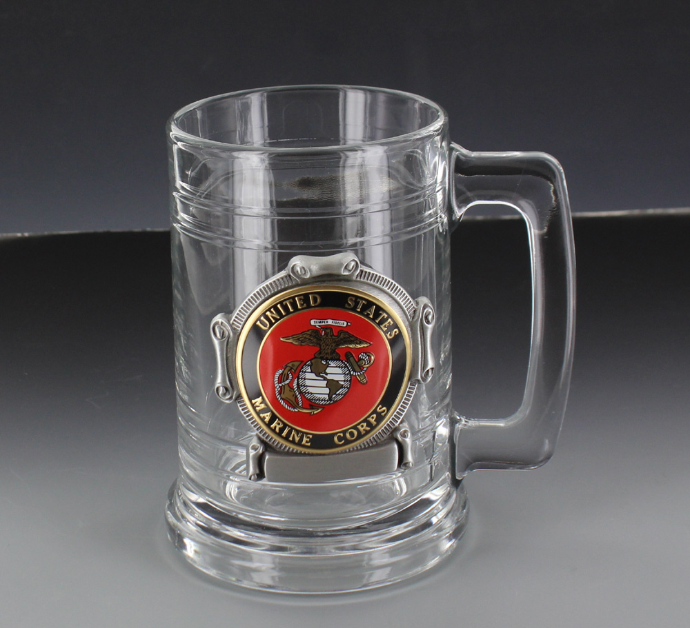 Item Description: Glass tankard with antique pewter finish. Casting holds 2 inch U.S Marine corps medallion. Capacity 15 ounce.