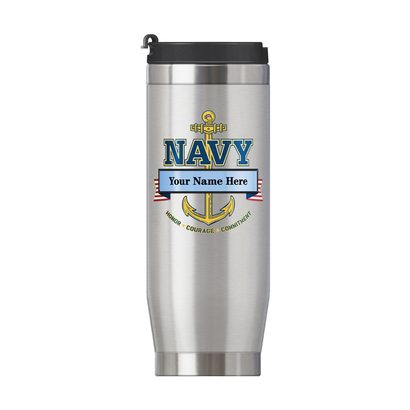 Item Description: U.S. Navy stainless steel travel mug, 16 ounce capacity. Fully wrapped logo officially licensed with scroll banner for name and rank personalization. Height is 7.85 inch and 3 inch diameter.