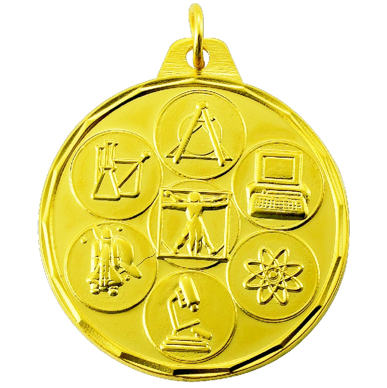 This 1-1/2 inch die-struck medal is engraved on its frontside with scientific themed imagery in a circular placement all surrounding a small vitruvian man. This medal comes available in gold, silver, or bronze, and the back can be custom engraved or imprinted.