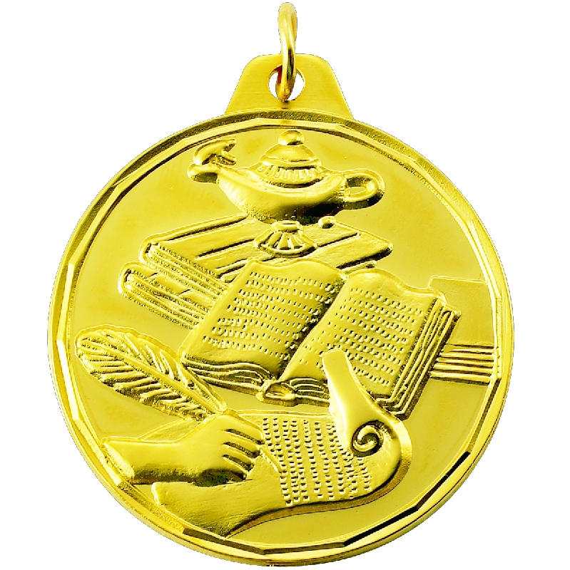 This 1-1/2 inch die-struck medal bears a variant of the 'lamp of learning' design on the front face and has a scalloped border to mimic a diamond cut style. The design depicts the lamp of learning atop a few books, and a hand using a quill on a scroll. This variant of the medal is available in gold, silver, bronze, and can be engraved or imprinted on the back face.