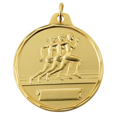 This 1-1/2 inch female track medal is decorated on the frontside with an engraving of three female athletes running side by side. Beneath them is a large scroll that can be custom imprinted, and the backside of the medal can be both imprinted or engraved. This medal is available in gold, silver, or bronze. - IMPRINTING COPY MUST ALL BE THE SAME.