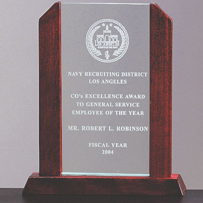 Item Description: 9 inch x 7-1/2 inch x 5/16 inch thick, Beveled Arch Award with Piano Finish Rosewood Frame.