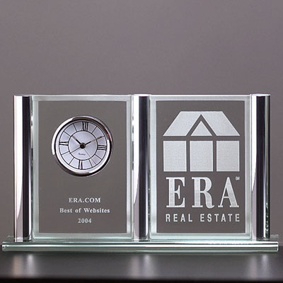 Item Description: 12 inch x 7 inch x 2-1/4 inch thick, Jaded Glass Photo Holder with Quartz Clock and Silver Frame. Gift Boxed.