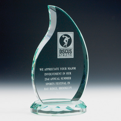 Item Description: 9-1/4 inch x 5 inch, 3/4 inch thick cut beveled jade glass flame, gift boxed.
