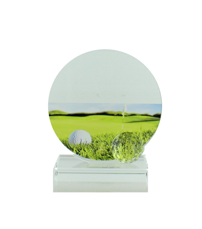 Item Description: 4-1/4 x 3-7/8 inch glass Golf trophy with ball and color printed golf image. This glass award comes with gift box.