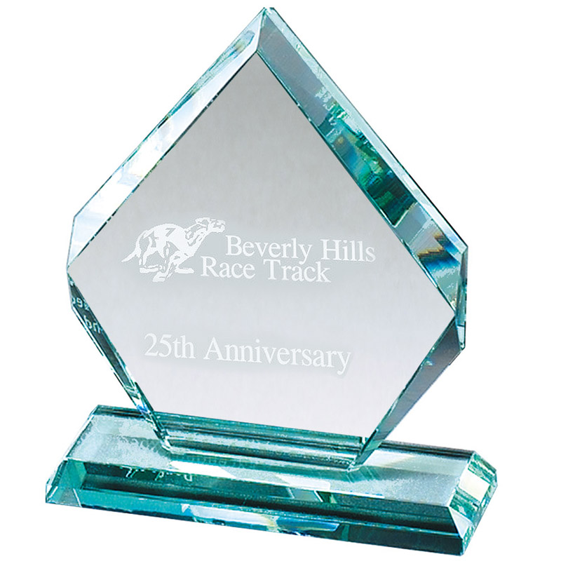 Item Description: 8-1/2"x 6-1/2" Arrowhead shaped glass award, gift boxed. Blue/green reflective edges.